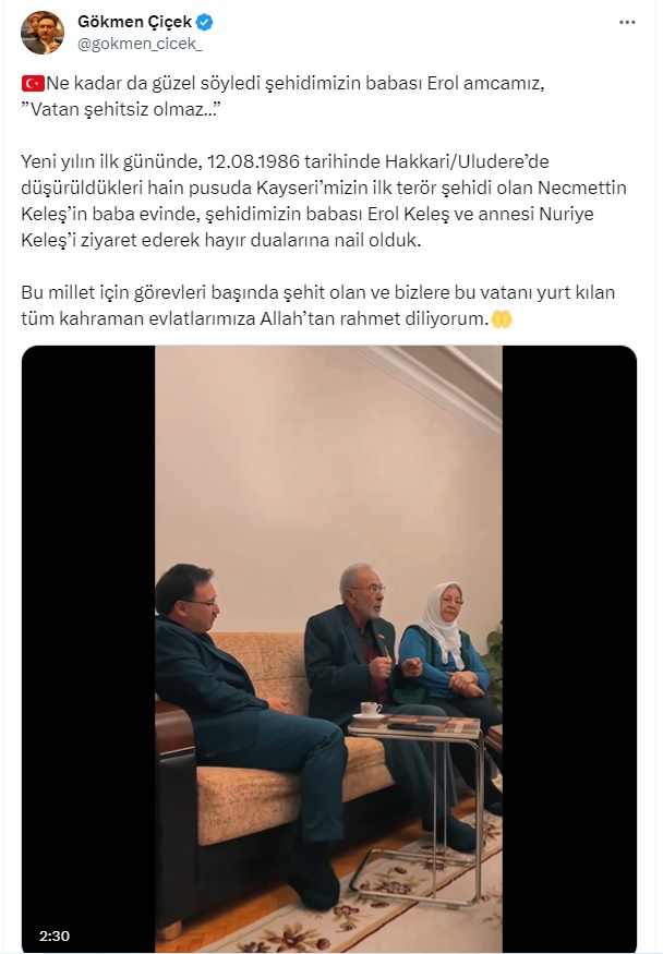 Vali Çiçek konuyla ilgili yaptığı paylaşımda ''Ne kadar da güzel söyledi şehidimizin babası Erol amcamız, ”Vatan şehitsiz olmaz…” Yeni yılın ilk gününde, 12.08.1986 tarihinde Hakkari/Uludere’de düşürüldükleri hain pusuda Kayseri’mizin ilk terör şehidi olan Necmettin Keleş’in baba evinde, şehidimizin babası Erol Keleş ve annesi Nuriye Keleş’i ziyaret ederek hayır dualarına nail olduk. Bu millet için görevleri başında şehit olan ve bizlere bu vatanı yurt kılan tüm kahraman evlatlarımıza Allah’tan rahmet diliyorum.'' ifadelerine yer verdi.