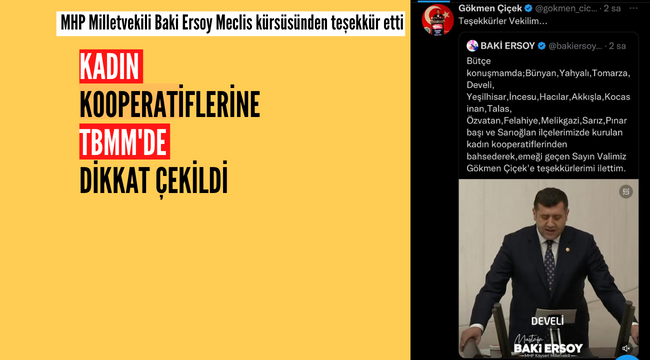 Kayseri Valisi Gökmen Çiçek, MHP Kayseri Milletvekili Baki Ersoy’a mecliste Kayseri’deki kadın kooperatiflerine yönelik yaptığı konuşmadan ve tarafına teşekkür edilmesine karşılık vererek vekil Ersoy’a teşekkürlerini iletti.