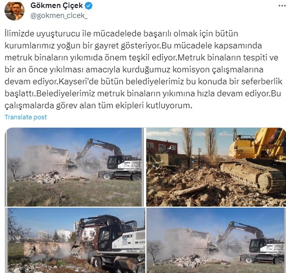Vali Gökmen Çiçek ise uyuşturucu ile mücadele kapsamında metruk binaların yıkımının önem arz ettiğini belirterek, “İlimizde uyuşturucu ile mücadelede başarılı olmak için bütün kurumlarımız yoğun bir gayret gösteriyor. Bu mücadele kapsamında metruk binaların yıkımı da önem teşkil ediyor. Metruk binaların tespiti ve bir an önce yıkılması amacıyla kurduğumuz komisyon çalışmalarına devam ediyor. Kayseri'de bütün belediyelerimiz bu konuda bir seferberlik başlattı. Belediyelerimiz metruk binaların yıkımına hızla devam ediyor. Bu çalışmalarda görev alan tüm ekipleri kutluyorum” dedi.