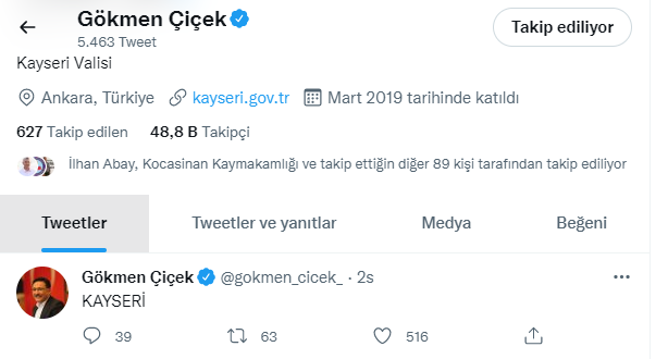 Tek kelimelik tweet akımına katılan Kayseri Valisi Gökmen Çiçek “KAYSERİ” mesajını paylaştı.Sosyal medya platformu Twitter'da son günlerde popüler olan tek kelimelik tweet akımına Kayseri Valisi Gökmen Çiçek'te katıldı. Çiçek mesajında büyük harflerle "KAYSERİ" yazdı.