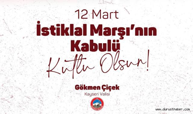 Kayseri Valisi Gökmen Çiçek, 12 Mart İstiklal Marşı’nın Türkiye Büyük Millet Meclisi tarafından kabul edilişinin 105. yıl dönümü dolayısıyla yayımladığı mesajda, milletin bağımsızlık ruhunu en güçlü şekilde ifade eden Mehmet Akif Ersoy’u rahmet, minnet ve saygıyla yâd etti.