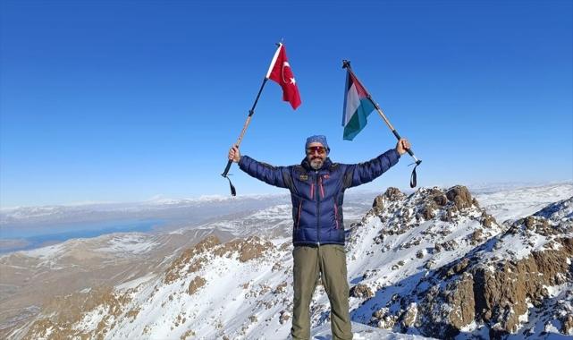 İsrail'in Gazze'ye yönelik saldırılarına tepki gösteren dağcılar, hayatını kaybeden Filistinliler anısına Van Gölü havzasındaki dağlara tırmanışlarını sürdürüyor. Kent merkezinde bir araya gelerek araçlarla bölgeye giden dağcılar, 4 saatlik zorlu tırmanışın ardından karla kaplı 3 bin 204 rakımlı Erek Dağı'nın zirvesine ulaştı.Dağcılar, zirvede Türk ve Filistin bayrakları açarak İsrail'in saldırılarına tepki gösterdi.Dağcılardan Fatih Arsakay, Filistin'de soykırım ve insanlık dramı yaşandığını belirterek, buna seyirci kalmamak için her hafta Van Gölü havzasındaki bir dağa tırmandıklarını söyledi.Özgür Filistin ve savaşta hayatını kaybedenler adına tırmanışları gerçekleştirdiklerini kaydeden Arsakay, "Bu farkındalığın devam ettirilmesi adına her hafta sonu Van Gölü havzasındaki bir dağın zirvesine Türk ve Filistin bayrağı dikeceğiz. Bugün dağcı arkadaşlarımızla ikinci tırmanışı gerçekleştirdik. Özgür Filistin ve savaşta hayatını kaybedenler için en yüksek zirvede İsrail'in saldırılarını protesto edeceğiz." diye konuştu. Muhabir: Hakan Sarı