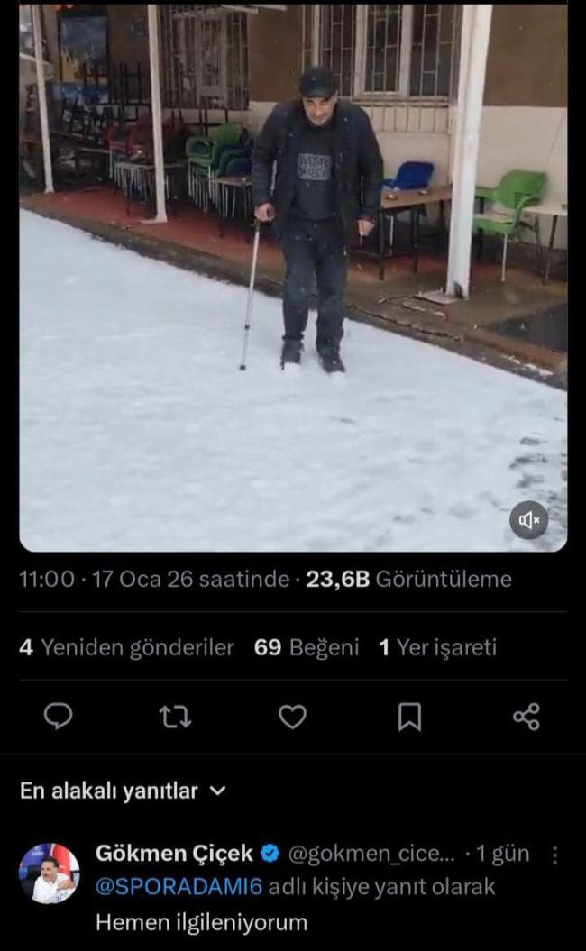 Kayseri’de bir vatandaş, yaşlı bir kişinin yalnız yaşadığını ve yürümekte güçlük çektiğini belirterek sosyal medya platformu üzerinden Kayseri Valisi Gökmen Çiçek’e seslendi. Vali Çiçek ise “hemen ilgileniyorum” yanıtını vererek vatandaşa destek sağlanacağını bildirdi.