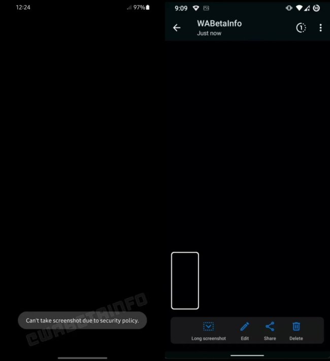 Yukarıdaki ekran görüntüsünde görebileceğiniz gibi, tek sefer görüntülenen fotoğraf ve videolarda ekran görüntüsü alınamıyor.Ekran görüntüsü almaya çalışan kullanıcıların karşısına, "Ekran görüntüsünü güvenlik politikasından dolayı alamazsınız." uyarısı çıkıyor.Üstelik üçüncü taraf uygulamaları kullanarak ekran görüntüsü alınırsa, alınan görüntü siyah oluyor ve bu uygulamalar da işe yaramıyor.WhatsApp gizliliğini artıran yeni özelliğin bu ay içinde kullanıma sunulması bekleniyor.