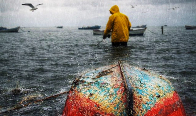 Bir balıkçı suyun içinde, dizlerine kadar denize batmış hâlde durur. Üzerindeki sarı yağmurluk, gri gökyüzüne karşı bir dirençtir aslında. Hayata karşı “buradayım” deme biçimi. Soğuk yağmur yağar, martılar çığlık çığlığa uçar, ama o adam gitmez. Çünkü bazı insanlar fırtına dinince değil, fırtınanın içinde kalmayı öğrenmiştir.