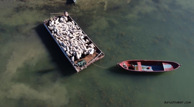Gölkaşı Mahallesi'ne yaklaşık 3 kilometre mesafede bulunan Çiftlik Mahallesi'nde besicilik yapan Mehmet Erdoğan, AA muhabirine, Çiftlik Mahallesi'nin 70 haneli, 195 nüfuslu olduğunu, ikiz kardeşiyle kiraladıkları Çeçen Adası'nda tarım ve hayvancılık yaptıklarını anlattı.Erdoğan, Çiftlik Mahallesi'nden kara yolu ile Gölkaşı Mahallesi'ne getirdikleri koyunları, ilkbaharda motorlu teknelerle hareket ettirdikleri özel yapım salla adaya çıkarttıklarını söyledi.Hayvanların kışı Çiftlik Mahallesi'ndeki ahırlarda geçirdiğini anlatan Erdoğan, "Adada sürülerimiz yem vermeden doğal ortamda beslendi. Şimdi kapalı ağıllarda yemle beslenecek. Çayırdan çıktıkları için 3-5 ay bakıma çekmemiz gerekiyor. Allah nasip ederse kasaplık ya da kurbanlık olarak satacağız. Adada kaldıklarında, uzunca bir süre yem maliyetinden de kurtulmuş oluyoruz." diye konuştu.Adada doğan kuzularla sayının dönüş yolculuğunda daha da arttığına işaret eden Erdoğan, sözlerini şöyle sürdürdü:"Her sene bu işi yapıyoruz, zorlukları da var, çünkü karadaki gibi olmuyor. Nakil esnasında havanın iyi olmasına, gölde dalga oluşturacak fırtına olmamasına çok dikkat ediyoruz. Bir de hayvanlar adada başıboş yayılım yaptığından yabanileşiyor. Dönüş yolculuğunda dubaya bindirirken başını çeken bir koyun var. O bindiği an diğerleri de takip ediyor. Biz de takviye ediyor, kovalıyoruz. Kovalamazsak, suyu gördüğünde geri kaçabilir. Önümüzdeki yıl mayıs ayında Allah nasip ederse tekrar koyunlarımızı adaya geçireceğiz."İlkbahar aylarında adaya 70-80 küçükbaş hayvan çıkardıklarını aktaran Erdoğan, dönüşte kuzularla birlikte sayının 100'e yaklaştığını dile getirdi.Ümmü Gülsüm Erdoğan da ailesine yardımcı olduğunu belirterek, "Şansımızdan hava iyiydi. Gölde dalga da yoktu. Koyun ve kuzularımızı sağ salim getirdik." dedi.Fotoğraf karelerine de yansıdı