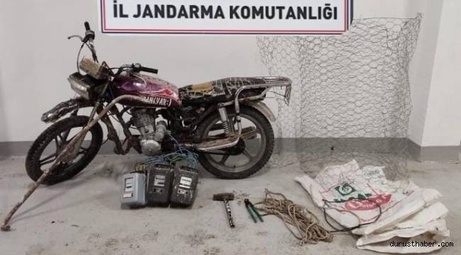 Jandarma ekipleri Karacabey Mahallesi Yavaş mevkisinde H.E'ye ait evde hırsızlık yapıldığı ihbarı üzerine harekete geçti.Çevreyi araştıran ekipler, hırsızlık zanlısı Ü.G'yi yaya olarak kaçarken gözaltına aldı.Ü.G'nin olay yerine plakasız motosiklet ile geldiği ve çevredeki diğer evlerden 3 elektrik sayacı, 4 metre enerji nakil kablosu, bahçe tellerini keserek çuval içerisinde motosiklete yüklediği tespit edildi.19 ayrı suçtan kaydının olduğu belirlenen şüphelinin jandarmadaki işlemleri devam ediyor.