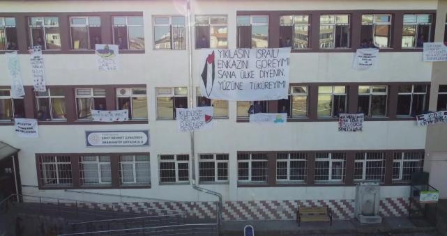 İsrail'in hain saldırılarına karşı okul öğrencileri tarafından hazırlanan pankartlarla ezgi eşliğinde yapılan gösterinin ardından, gelirlerinin tamamını Filistin'e bağışlanmak üzere okulda kermes düzenlendi.