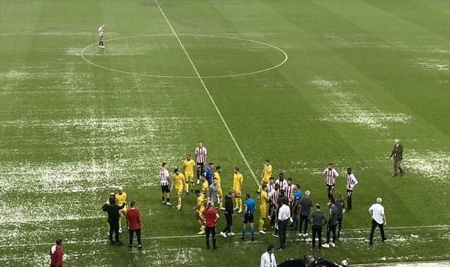 Maçın 12. dakikasında hakem Burak Şeker, iki takımın oyuncularının zeminde topun zıplamadığını söylemesi üzerine karşılaşmayı durdurdu.Hakem Burak Şeker, bir süre iki ekibin teknik heyeti ile görüştükten sonra takımları soyunma odasına gönderdi.Futbolcular ve hakemlerin soyunma odasına girmesiyle birlikte görevliler, zemini çekçekle temizlemeye başladı.Burak Şeker, yaklaşık 20 dakika sonra tekrar sahaya çıktı. Şeker, sahanın 3 noktasında topu havaya atarak zemini kontrol etti.Topun zeminde zıplamaması üzerine Şeker, maçı erteledi.Statta yapılan anonsta maçın Türkiye Futbol Federasyonunun belirleyeceği bir tarihte oynanacağı açıklandı.