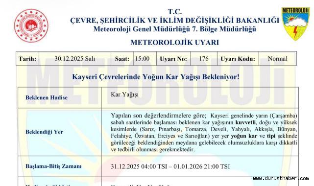 Meteoroloji Genel Müdürlüğü 7. Bölge Müdürlüğü, Kayseri ve çevreleri için yoğun kar yağışı uyarısında bulundu. Yapılan son değerlendirmelere göre, kar yağışının yarın sabah saatlerinden itibaren etkisini artırması bekleniyor.