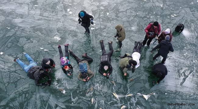 Taşlıçay ilçesine yaklaşık 30 kilometre uzaklıktaki Sinek Yaylası mevkisinde bulunan 2 bin 241 rakımdaki göl, sahip olduğu doğal güzellikleriyle yılın her dönemi çok sayıda yerli ve yabancı turisti ağırlıyor.Kuş, balık türleri ve iki adanın bulunduğu gölün yüzeyi, dondurucu soğukların etkisiyle tamamen dondu.Yaz aylarında kamp yapmak isteyenlerin tercih ettiği göl, kışın da buzla kaplı yüzeyiyle fotoğraf tutkunlarının ilgisini çekiyor.Bölgenin tarihi ve doğal güzelliklerini görmek için İstanbul'dan gelen bir grup fotoğraf tutkunu, buzla kaplı gölün üzerinde yürüyüş yaptı.Burada fotoğraf çeken grup, çevredeki köylerde yaşayan vatandaşların olta ile balık avlamasını izleyip bu anları fotoğrafladı.Fotoğraf tutkunları, daha sonra Diyadin ilçesindeki kaplıcaları da ziyaret etti.Donmuş gölün üzerinde ilk defa yürüdülerFotoğrafçı Mürsel Yağcıoğlu, AA muhabirine, daha önce de bölgeye grup halinde fotoğraf tutkunlarını getirdiklerini, gelenlerin bölgenin tarihi ve doğal güzelliklerini çok beğendiğini söyledi.16 kişilik ekiple fotoğraf çekimi için önce Van, sonra da İshak Paşa Sarayı'nı ziyaret ettiklerini belirten Yağcıoğlu, ilkbaharda da bölgeye gelmeyi planladıklarını bildirdi.Muhteşem doğasıyla dikkati çeken Balık Gölü'nde fotoğraf çalışması yaptıklarını ifade eden Yağcıoğlu, şunları kaydetti:"Hem dağlarda hem de gölde muazzam bir görüntü var. Buzun üzerinde yürümek çok heyecanlıydı. Buzdan sesler geliyordu ve üzerinde yürürken heyecanla fotoğraf çektik. Grubumuzdaki birçok kişi donmuş bir gölün üzerinde ilk defa yürüdü. Biz özellikle büyükşehirlerde yaşayanlar ve doğayı özleyen insanlar olarak bu tür yerlere geldiğimizde aldığımız keyfin tadına doyum olmuyor."Tekrar gelecekler